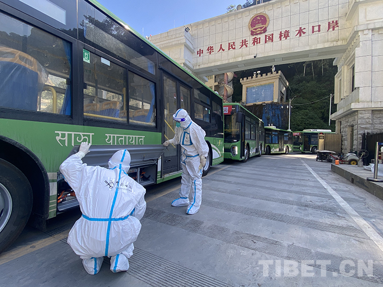 圖為拉薩海關(guān)所屬聶拉木海關(guān)關(guān)員監(jiān)管國產(chǎn)新能源公交車出口