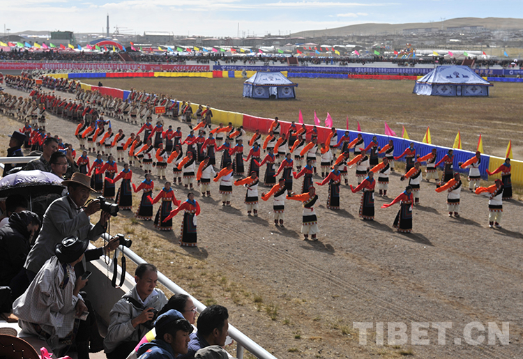 這是來(lái)自那曲地區(qū)(現(xiàn)那曲市)各縣代表隊(duì)在進(jìn)行入場(chǎng)式表演。當(dāng)日,那曲賽馬藝術(shù)節(jié)在藏北首府那曲鎮(zhèn)開(kāi)幕(唐召明2013年8月10日攝)