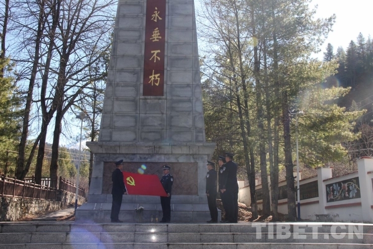 圖為西藏邊檢總站執(zhí)法調(diào)查支隊(duì)執(zhí)法調(diào)查七隊(duì)民警在亞東革命烈士陵園烈士紀(jì)念碑前對黨旗宣誓 攝影:李渠成