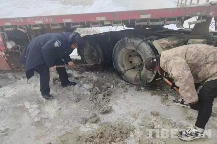 民警抵達現場,首先確認了司機身體狀況良好。在了解情況后,與司機共同對車輛開展救援工作。經過一段時間努力,仍無法將被困車輛拖離被困地。經與司機協商決定,先行將其帶至曲松鄉(xiāng)妥善安頓,而后協調駐地友鄰單位用重型車輛救援被困車輛。最終在友鄰單位的幫助下,被困近20小時的半掛車成功脫困。