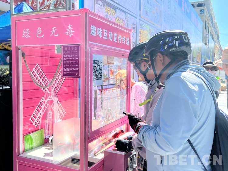 圖為路過群眾在趣味互動(dòng)宣傳終端掃碼答題抓“牦牦” 攝影:德吉卓瑪