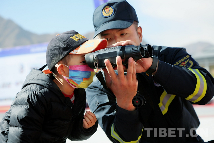 圖為啟動(dòng)儀式現(xiàn)場拉薩消防指戰(zhàn)員向前來參觀的小朋友介紹測(cè)距儀