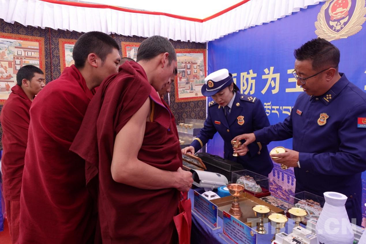 圖為啟動(dòng)儀式現(xiàn)場拉薩消防指戰(zhàn)員向僧人科普日常寺廟消防安全知識(shí)