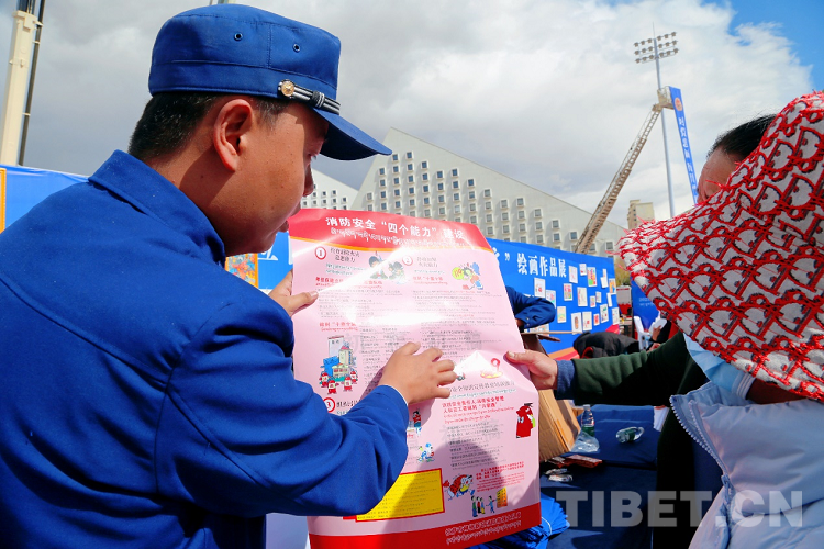 圖為啟動(dòng)儀式現(xiàn)場拉薩消防指戰(zhàn)員向市民科普日常消防安全知識(shí)