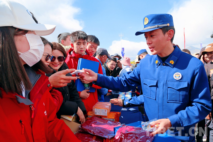 圖為啟動(dòng)儀式現(xiàn)場拉薩消防指戰(zhàn)員向市民發(fā)放文創(chuàng)產(chǎn)品和宣傳資料