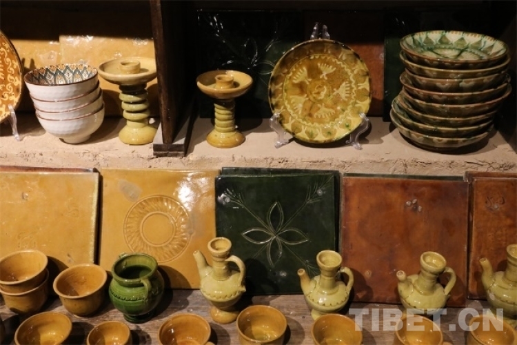 這里的土陶都緊湊而有序地被擺放在架子上,或者集中放在房間的空地上圍成一圈。一眼看去,架子上的土陶手工藝品都透露出泥土本身的顏色質(zhì)感,部分碗碟、杯具等制品通過各類顏色的浸染,呈現(xiàn)出青翠欲滴或金黃澤亮的顏色樣態(tài),在無聲中展現(xiàn)著古樸技藝的獨(dú)特魅力。