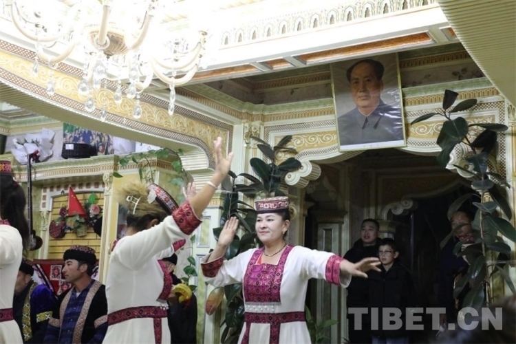 一路前行,在喀什地區(qū)澤普縣的布依魯克塔吉克風(fēng)情小鎮(zhèn),美輪美奐的獨(dú)棟小院是小鎮(zhèn)居民區(qū)的特色,在夕陽(yáng)的映襯下顯得格外溫馨舒適。好客的塔吉克族老人巴哈爾古麗·熱扎熱情地邀請(qǐng)走訪團(tuán)一行前往家里做客。穿過(guò)小院,一進(jìn)客廳就看見(jiàn)門(mén)廳上方懸掛著的毛主席畫(huà)像。當(dāng)所有人落座后,鷹笛聲響起,身穿塔吉克民族服飾的人們開(kāi)始翩翩起舞,充滿了載歌載舞的歡樂(lè)氣氛。