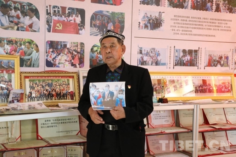 在講述故事的時(shí)候,沙勒克江·依明老人總是把腰背挺得直直的,雙眼的目光有神而堅(jiān)定,說話吐詞帶有重音和落地實(shí)感。當(dāng)他拿起照片,講起自己觀看天安門廣場的升旗儀式時(shí),他會(huì)用腳一聲一聲地踏出聲音,沉浸描述當(dāng)時(shí)國旗班的腳步聲帶給他的心靈震撼。而隨著他的動(dòng)作,我們的身心也顫抖了起來。