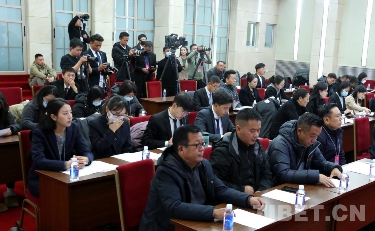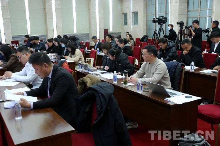 圖為中央駐藏媒體及西藏自治區(qū)媒體代表在會上認真聽取新聞發(fā)言人通報相關情況 攝影:王佳豪