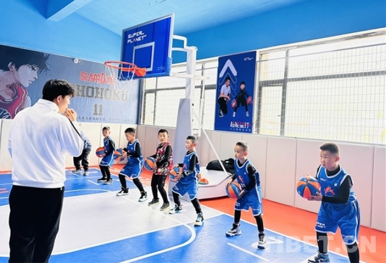 圖為籃球培訓(xùn)課上,身穿籃球服的小朋友在認(rèn)真聽課