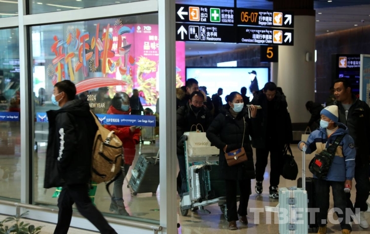 圖為春運(yùn)首日,抵達(dá)拉薩貢嘎機(jī)場的乘客 攝影:王佳豪