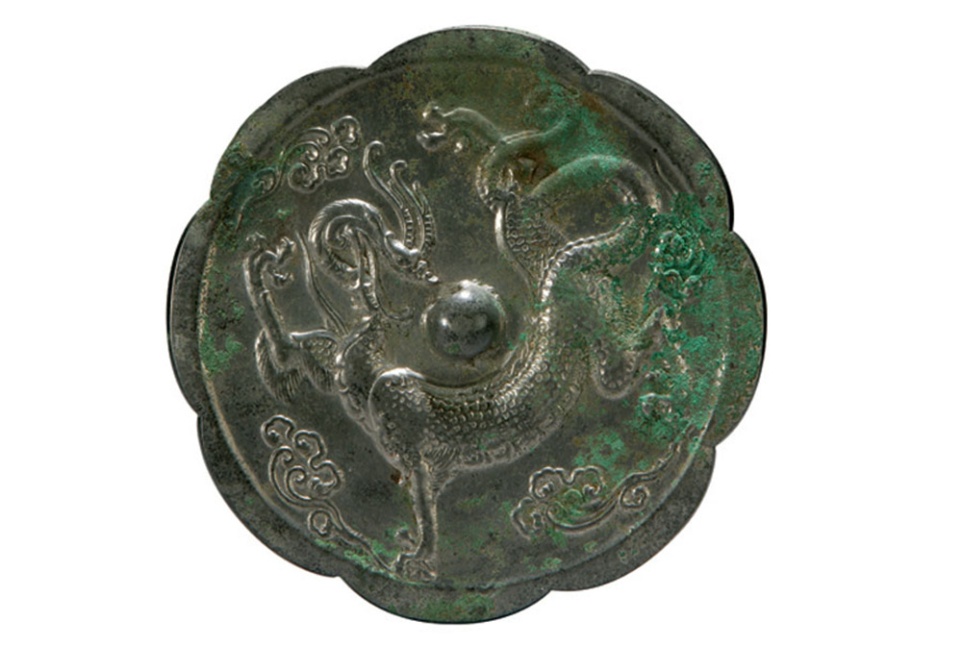 此件青銅龍紋鏡為葵花形,鏡背以紐為中心,龍紋為單體,呈蟠曲狀,四周分布云紋。龍的長(zhǎng)角翹起,巨口張開(kāi),身體遒勁,脖頸細(xì)長(zhǎng),似在回首戲珠。唐代有帝王在千秋節(jié)向群臣頒賜銅鏡之俗,這種賜予臣下的銅鏡多以龍紋裝飾,稱(chēng)千秋鏡或天子鏡。也許是天子所賜,所以此龍的姿態(tài)看上去遒勁有力,同時(shí)又顯得生動(dòng)活潑,仿佛在每日的使用中能給人以活力。(中國(guó)西藏網(wǎng)綜合/周晶)