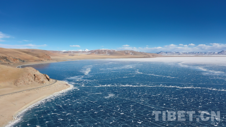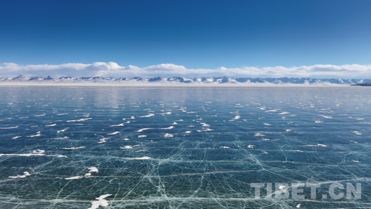 爬上一座山丘,視野陡然明亮開闊起來。原本土黃色的藏北天然牧場高低起伏,黑牦牛零星地散落在山坡,登上高處后,天際圣境納木錯便映入眼簾。初春時節(jié)的拉薩依然春寒料峭,納木錯的落雪還未完全消融,站在高處俯視,這片安靜的大湖被陽光反射得白茫茫一片。更幸運的是碰到了晴好的天氣,白云與湖冰相襯,亦與遠山相接,視線盡頭的念青唐古拉山脈直視無礙,畫面猶如“半池白云半池玉”般頗具美感。
