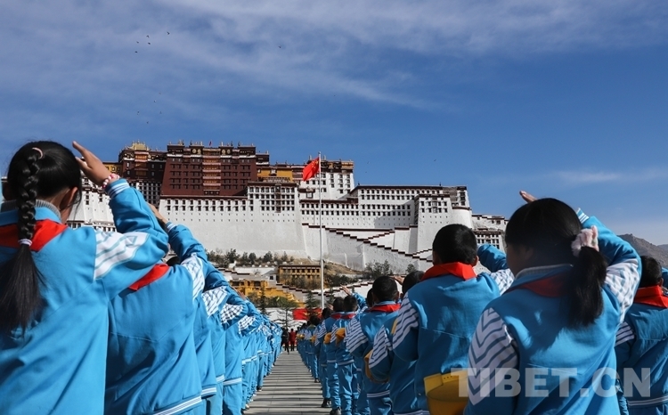 國旗下,拉薩各族各界干部群眾衷心祝愿?jìng)ゴ笞鎳臃睒s昌盛,祝愿西藏的明天更加美好。