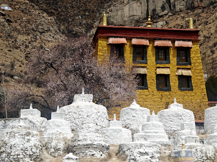圖為帕邦喀古建筑與桃樹同框的畫面
