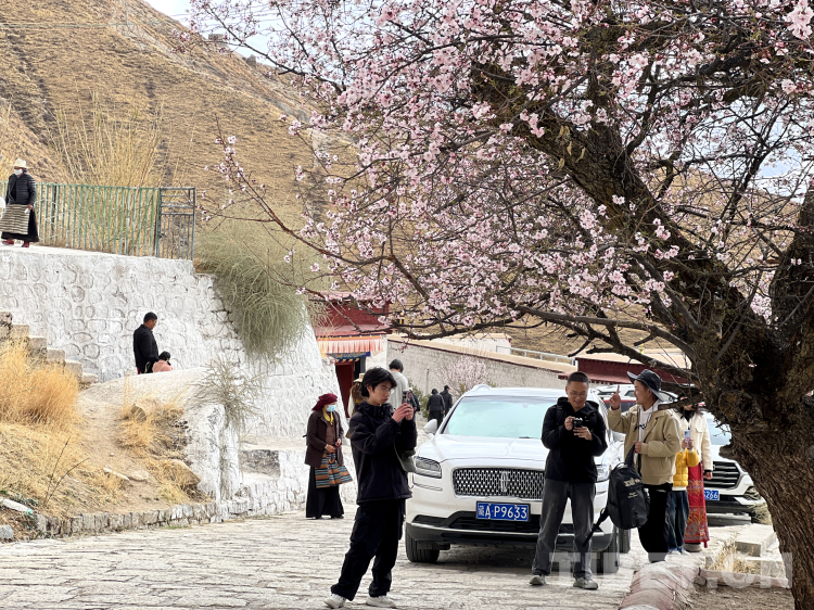圖為帕邦喀周圍的桃花盛開,引來了諸多當?shù)厥忻窕蛴慰图娂娗巴p花、拍照
