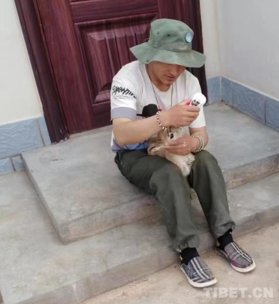 圖為次仁在喂養(yǎng)救助的藏羚羊幼崽 圖片由次仁提供
