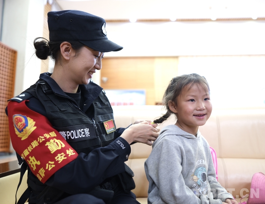 圖為5月31日,馬曉琴在執(zhí)勤時,深受小朋友的喜愛,拉著格桑花辮起頭發(fā),想要跟格桑花一樣靚麗 攝影:賀瑞明