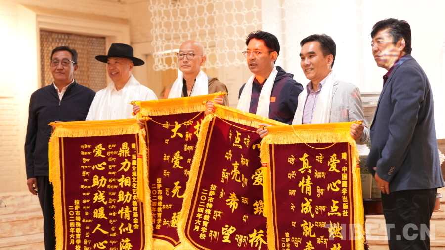 活動(dòng)最后,中國(guó)藏學(xué)出版社向拉薩市特殊教育學(xué)校學(xué)生贈(zèng)送繪畫(huà)用品,拉薩市特殊教育學(xué)校云旦平措校長(zhǎng)、尼瑪書(shū)記向現(xiàn)場(chǎng)來(lái)賓贈(zèng)送新書(shū)。