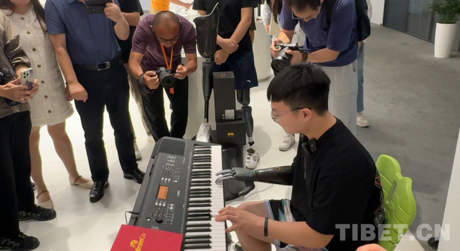 圖為BrainCo強(qiáng)腦科技產(chǎn)品體驗(yàn)官周鍵在彈鋼琴