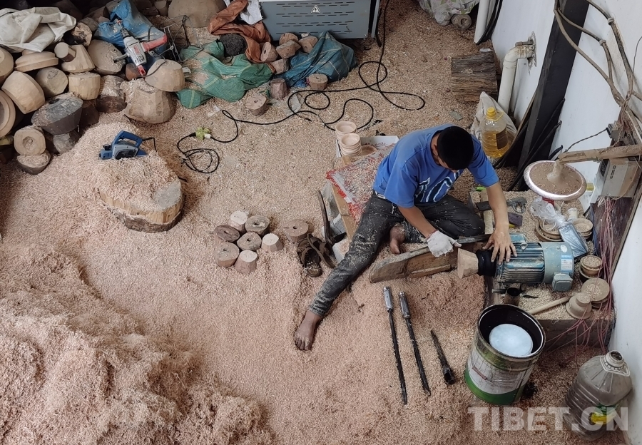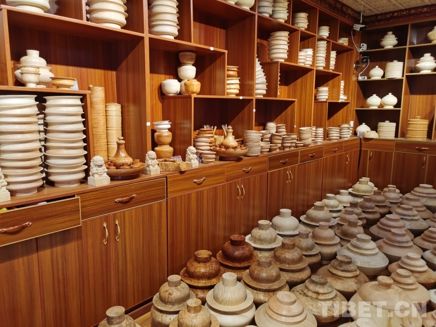 我們首先來(lái)到的是四川省非物質(zhì)文化遺產(chǎn)項(xiàng)目——藏族民間車(chē)模技藝體驗(yàn)基地。基地一層是工作區(qū),一位師傅正在全身心制作木質(zhì)生活用具,絲毫沒(méi)有察覺(jué)我們的到來(lái)。于是沒(méi)有過(guò)多打擾,我們徑直來(lái)到二樓展品陳列區(qū)。藏族民間車(chē)模技藝傳承人格絨次仁的兒子洛絨次仁拿起一個(gè)木碗,臉上露出樸實(shí)而靦腆的微笑介紹道,“這些都是選用樹(shù)瘤制作而成,一般選用鵝掌木、杜鵑等15類(lèi)樹(shù)木,因?yàn)橹蹦救菀琢验_(kāi)。為了用具不裂開(kāi),處理后的樹(shù)瘤煮水后需晾干五至六個(gè)月,一個(gè)木碗制作工序可能要長(zhǎng)達(dá)半年才能完成。此項(xiàng)技藝在家族傳承至今已有四代,我們要做就做好一點(diǎn)?!甭褰q次仁大哥希望更多人能了解這項(xiàng)非物質(zhì)文化遺產(chǎn),有更多人愿意來(lái)傳承學(xué)習(xí)這份技藝,有更多人喜歡他們制作的這些木質(zhì)生活用具。