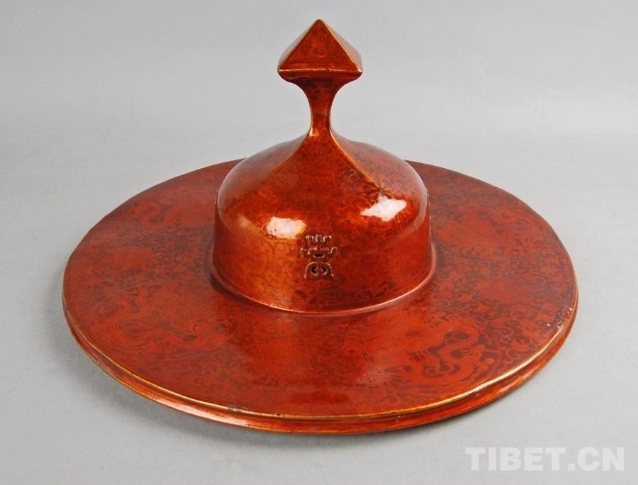 14號(hào)藏品為僧官帽,出自西藏,進(jìn)入館藏時(shí)間為1905年。據(jù)博物館介紹,這頂漆帽原屬于寺院一位僧官所穿服飾的一部分。過去,西藏地方政府實(shí)行“政教合一制度”,寺院作為一個(gè)地方的宗教事務(wù)和寺院自身的管理者和統(tǒng)治者,同時(shí)又是這個(gè)地方社會(huì)的主要管理者和統(tǒng)治者。因此,遍布西藏各地的寺院往往都是當(dāng)?shù)氐恼?、?jīng)濟(jì)、文化中心,具備政治、經(jīng)濟(jì)、教育、司法等職能。寺院內(nèi)部設(shè)立不同級(jí)別或不同分管領(lǐng)域的僧官來共同管理整個(gè)寺院的內(nèi)外政教事務(wù)。
