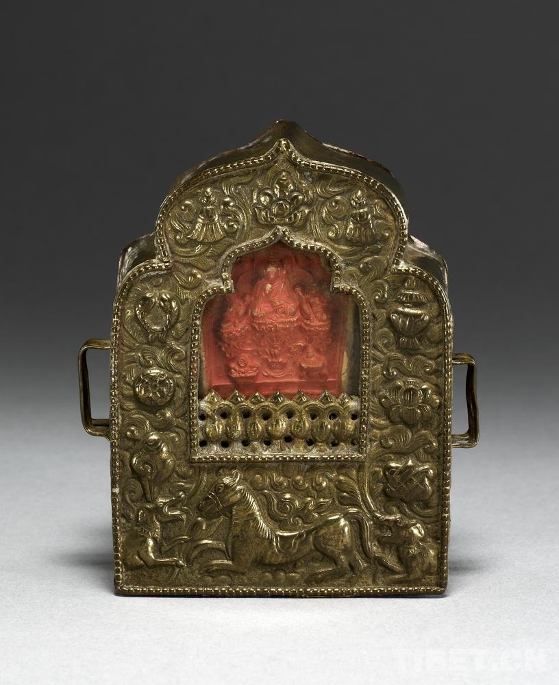 19號(hào)藏品為銅制“嘎烏”,內(nèi)裝有“擦擦”和香料包,出自西藏,進(jìn)入館藏時(shí)間為1905年?!案聻酢?,是藏語的音譯,指護(hù)身佛的盒子,即小型佛龕。盒子里一般裝有“擦擦”佛像、印著經(jīng)文的綢片、舍利子或者甘露丸、由高僧念過經(jīng)的藥丸,以及活佛的頭發(fā)、衣服的碎片等。“嘎烏”還是精美的裝飾品。其形狀不一,一般為銀質(zhì)或銅質(zhì),盒面上鑲嵌有瑪瑙、綠松石,雕刻有多種花紋圖案。