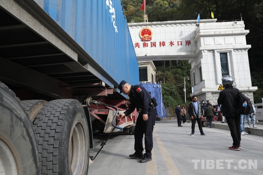 圖為聶拉木邊檢站民警對出境貨車進行查驗