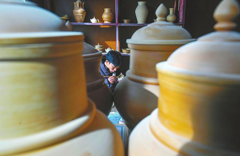 12月的冬日陽光透過壤巴拉藏式陶藝傳習(xí)所的窗口,在飛轉(zhuǎn)的泥坯上折射出金色的光芒。在四川省阿壩藏族羌族自治州壤塘縣上壤塘鄉(xiāng)仁棚村的這間陶藝傳習(xí)所,澤郎斯加正在陶器原型上修坯。澤郎斯加和傳習(xí)所的18名學(xué)員,都來自于壤塘縣貧困牧民家庭,經(jīng)過六年的學(xué)習(xí)和進(jìn)修,他們?cè)谔账噦髁?xí)所已熟練掌握了藏陶的拉坯、修坯、燒制等綜合技藝,并完成了德育、藏文、漢語、數(shù)學(xué)、電子商務(wù)、藏漢文書法、基礎(chǔ)繪畫等課程培訓(xùn)。