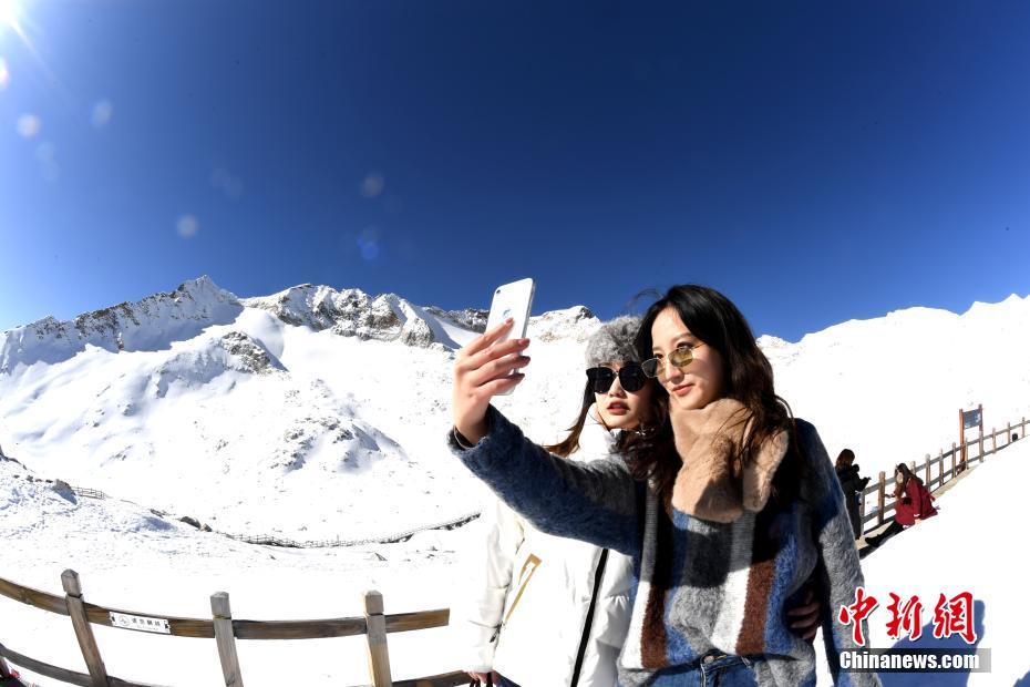 游客在冰川上拍照留念。安源