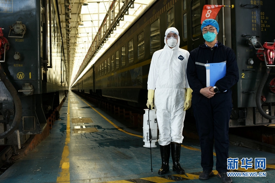 在西寧車輛段車庫(kù)內(nèi),防疫人員對(duì)每列旅客列車進(jìn)行全面殺毒。新華網(wǎng) 李俊 攝