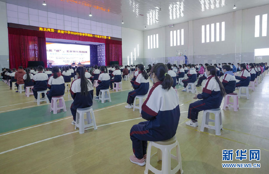 3月14日,海北州第一高級(jí)中學(xué)高一年級(jí)學(xué)生在體育館內(nèi)進(jìn)行防疫健康教育開(kāi)學(xué)第一課。新華社 吳剛 攝