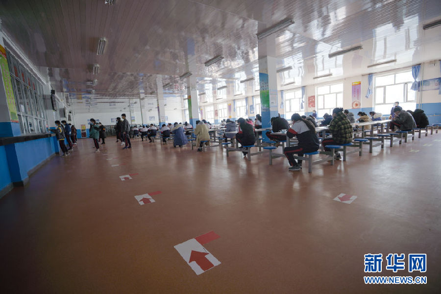3月14日,海北州第一高級(jí)中學(xué)的學(xué)生正在餐廳分桌就餐。新華社 吳剛 攝