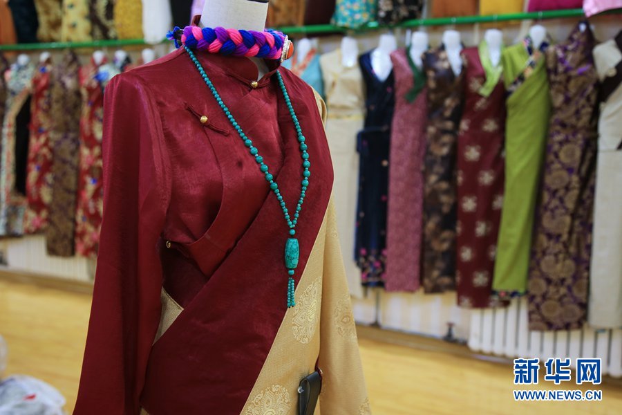 在諾布嶺民族服飾有限公司的制衣車間,藏族婦女才樣正在翻看藏袍,從衣領(lǐng)、線頭到裁剪、花紋……這里改一下,那里重新縫一下,一件合格的藏袍在出廠銷售前,必須要通過她的認(rèn)可。