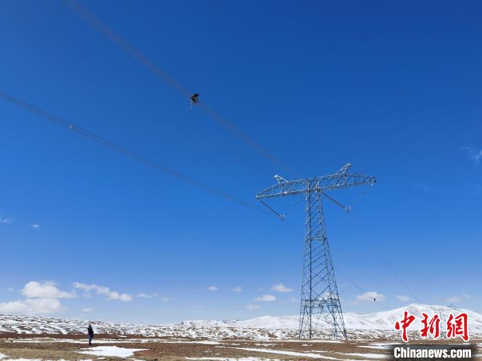 圖為5月13日,國網(wǎng)青海檢修公司輸電運(yùn)檢人員在海拔五千米的風(fēng)火山地區(qū)對“電力天路”±400千伏柴拉直流線路進(jìn)行空中走線巡檢,查找并消除線路缺陷?!≈x莉蓉 攝