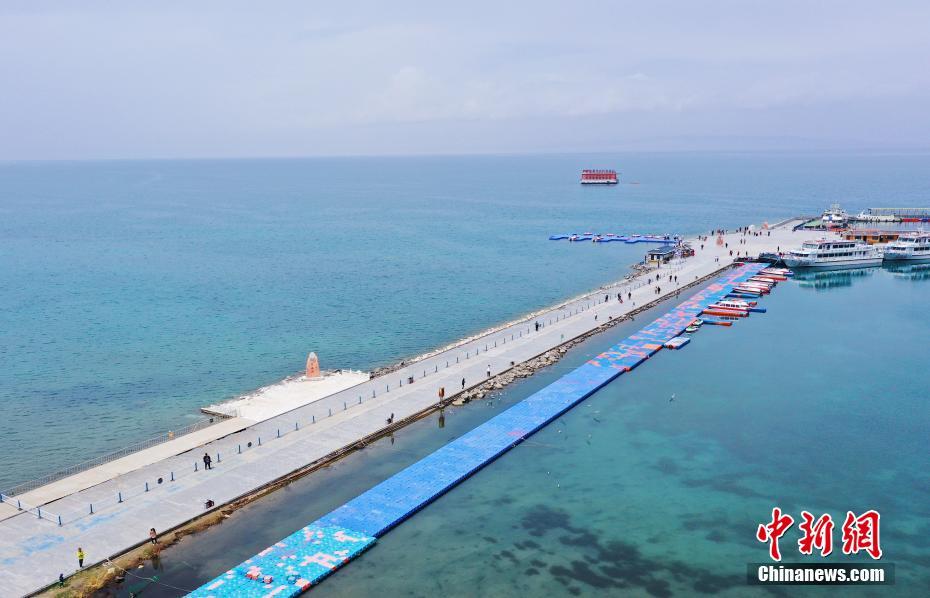 5月19日,航拍被碧綠湖水包圍的青海湖二郎劍景區(qū)碼頭。初夏時節(jié),青海省海南藏族自治州青海湖畔萬物復(fù)蘇,碧水藍(lán)天,宛如油畫。中新社記者 馬銘言 攝