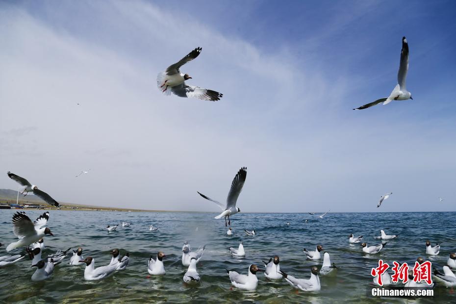5月19日,水鳥在青海湖自由翱翔。初夏時節(jié),成群的魚鷗、斑頭雁等多種水鳥在青海省海南藏族自治州青海湖景區(qū)內(nèi)自由翱翔,嬉戲玩耍,吸引游客前來觀賞。中新社記者 馬銘言 攝