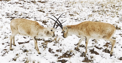 站在離它們不遠(yuǎn)的地方,相互平靜地對(duì)視,許久,一只小藏羚羊才走上前來,把臉慢慢靠近蹲在地上的才仁多杰的面頰。