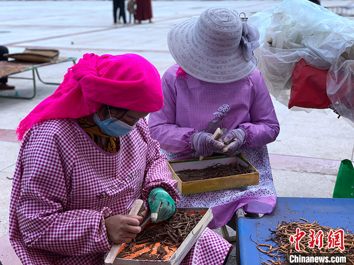 圖為6月13日,交易市場內(nèi)正在清刷蟲草上泥土的刷草工。中新社記者 李江寧 攝