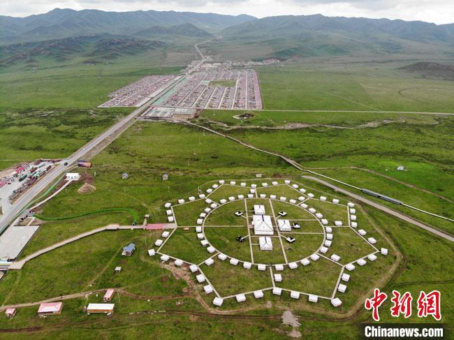 尕秀村的帳篷城由108頂大小各異的藏式風(fēng)格帳篷組成??罩懈╊?,一頂頂帳篷如同一顆顆璀璨的珍珠,點(diǎn)綴著曬銀灘草原的秀美。楊艷敏 攝