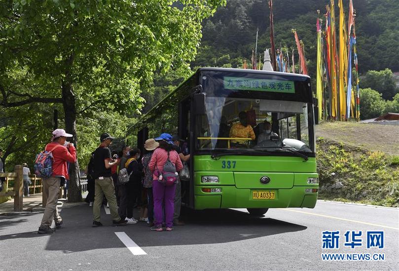 游客在九寨溝景區(qū)內乘坐觀光車(6月18日攝)。新華社記者 劉坤 攝
