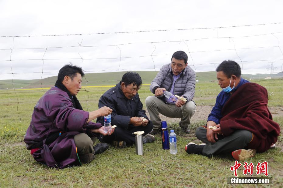 7月21日,青海省海北藏族自治州剛察縣伊克烏蘭鄉(xiāng)剛察貢麻村的索南木旦巴(左一)、仁增才讓(左二)、吉科加(右二)、萬(wàn)瑪扎西(右一)四人在撿拾著草場(chǎng)垃圾途中,吃餅子,喝礦泉水充饑。2008年,萬(wàn)瑪扎西路在村支書的支持下,與索南木旦巴、仁增才讓、吉科加三個(gè)人組建了義務(wù)環(huán)保隊(duì),自此一干就是12年。他們?cè)趽焓袄耐瑫r(shí)進(jìn)行著環(huán)保宣傳,希望從源頭減少垃圾。仁增才讓說(shuō):“現(xiàn)在草原上的垃圾幾乎是看不到了?!敝行律缬浾?馬銘言 攝