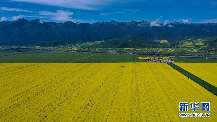 這是7月22日拍攝的門源回族自治縣境內(nèi)的油菜花田(無人機照片)。新華社記者 吳剛 攝