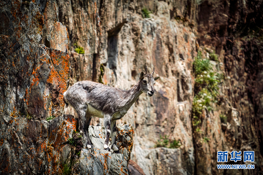 一只巖羊站在巖壁上眺望。新華網(wǎng) 宋忠勇 攝
