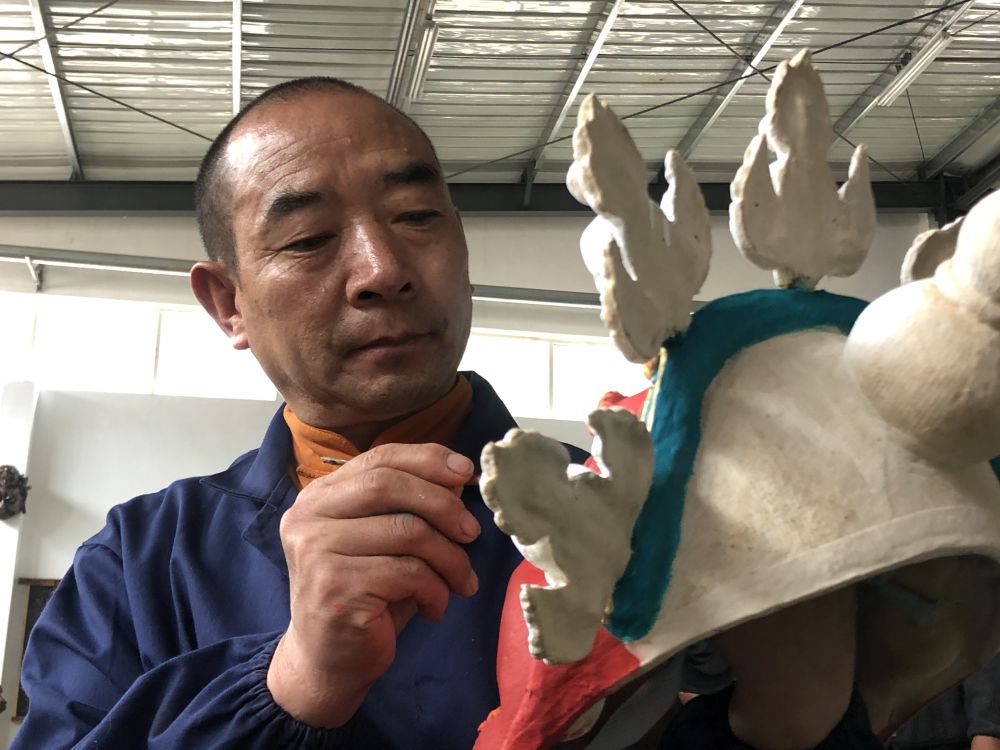 青海玉樹(shù)藏族自治州囊謙縣扶貧產(chǎn)業(yè)園內(nèi),手工藝人在制作傳統(tǒng)面具(7月4日手機(jī)拍攝)。新華社記者 李占軼 攝