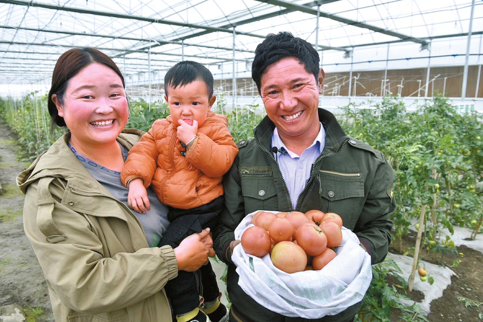 捧著種出的西紅柿,旦真貢(右)笑逐顏開(kāi)。