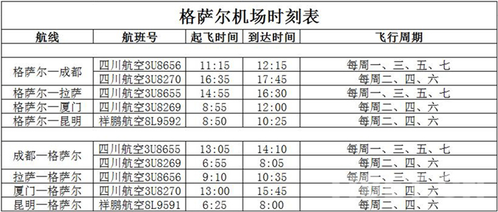此次開通的新航線班期計(jì)劃為每周二、四、六三班,機(jī)型為波音737,上午6時(shí)28分從昆明長水機(jī)場起飛,8時(shí)整抵達(dá)甘孜格薩爾機(jī)場;上午8時(shí)50分從甘孜格薩爾機(jī)場返航,10時(shí)25分抵達(dá)昆明,中途飛行時(shí)間僅需1個(gè)半小時(shí)。開航初期,川航推出了該航班的優(yōu)惠機(jī)票。