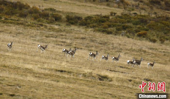 圖為臀部呈白色桃心的藏原羚排隊奔跑。三江源國家公園森林公安局 供圖