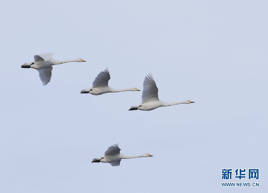 大天鵝在青海湖上空排隊飛翔。(資料圖)新華網(wǎng) 宋忠勇 攝