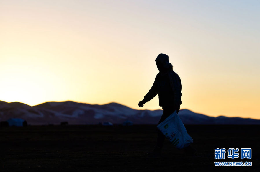 10月28日,在青海省玉樹藏族自治州稱多縣境內(nèi)的嘉塘草原上,生態(tài)管護(hù)員扎西才文在撿拾垃圾。新華社記者 張龍 攝